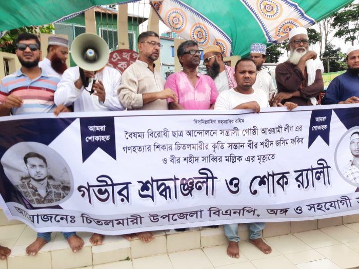 উপজেলা বিএনপির অঙ্গ ও সহযোগী সংগঠন আয়োজিত বাগেরহাটের চিতলমারীতে বৈষম্য বিরোধী ছাত্র আন্দোলনে সন্ত্রাসী গোষ্ঠী আওয়ামীলীগ এর গণহত্যার শিকার চিতলমারীর কৃতি সন্তান বীর শহীদ জসিম ফকির ও বীর শহীদ সাব্বির মল্লিক এর মৃত্যুতে গভীর শ্রদ্ধাঞ্জলি ও শোক র্যালি হয়েছে। বৃহস্পতিবার (১৫ আগস্ট) সকাল ১০টায় উপজেলা শহীদ মিনার চত্বরে আলোচনা, ও শোক র্যালি উপজেলা প্রধান প্রধান সড়ক প্রদক্ষিণ করে উপজেলা মোড়ে শেষ হয়।