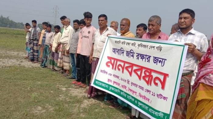 ঝিনাইদহ জেলার শৈলকুপা উপজেলার ভাটই বাজার এলাকার কুলচারা গ্রামের তিন ফসলি জমিতে কারখানা নির্মাণ বন্ধের দাবিতে উপজেলার ভাটই বাজার এলাকায় বুধবার দুপুরে মানববন্ধন করেছে এলাকাবাসী। স্থানীয় গণ্যমান্য ব্যক্তিবর্গ এতে অংশ নেয়। ভুক্তভোগি সরোয়ারের সভাপতিত্বে মানববন্ধনে বক্তব্য রাখেন, শাহাদৎ হোসেন, ওলিয়ার হোসেন, মাজেদ বিশ্বাস, হবিবর রহমান, আমির হোসেন, মাসুদ রানা, আবু কাশেম, মনোয়ারা বেগম, স্বপ্ন খাতুন, মিরা খাতুন, ডালিম, রহিমা খাতুন, হোসনেয়ারা, আলমগীর হোসেন ঠান্ডু প্রমুখ। বক্তারা বলেন, মাননীয় প্রধানমন্ত্রী শেখ হাসিনা কোন ফসলি জমি নষ্ট করে শিল্প প্রতিষ্ঠান না করার নির্দেশনা দিয়েছেন। এছাড়া কোন জাতিকে পেছনে ফেলে দেশের উন্নয়ন সম্ভব নয়।কিন্তু কিছু কুচক্রিমহল প্রধানমন্ত্রীর ঘোষণা উপেক্ষা করে তিন ফসলির জমিতে অবৈধ স্থাপনের পাঁয়তারা করছে। বর্তমানে জমিতে তারা ধান সহ বিভিন্ন ফসলাদী চাষাবাদ করছেন। শিল্পপ্রতিষ্ঠান গড়ার জন্য শিল্পনগরি বিসিকে অনেক জায়গা সরকারের পতিত রয়েছে।সেখানেও হতে পারে। কিন্তু ফসলি জমি নষ্ট করে কারখান নির্মাণ যুক্তিযুক্ত নয়।