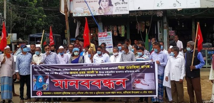 খাগড়াছড়ি জেলার মাটিরাঙ্গায় দিনাজপুরের ঘোড়াঘাট উপজেলা নির্বাহী অফিসার ওয়াহিদা খানম ও তাঁর পিতা ওমর আলী‘র উপর হামলার প্রতিবাদে দুষ্কৃৃতিকারীদের দৃষ্টান্তমুলক শাস্তির দাবীতে ঘন্টাব্যপী মানববন্ধন করেছে বাংলাদেশ মুক্তিযোদ্ধা সংসদ মাটিরাঙ্গা পৌর কমান্ড ও মুক্তিযোদ্ধা সংসদের সন্তান কমান্ড মাটিরাঙ্গা উপজেলা শাখা ।